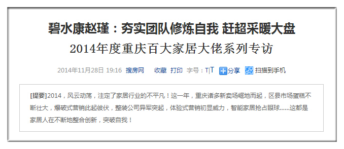【專訪背景】2014,風(fēng)云動(dòng)蕩,注定了家居行業(yè)的不平凡!這一年,重慶諸多新賣場(chǎng)崛地而起,區(qū)縣市場(chǎng)蛋糕不斷壯大,爆破式營(yíng)銷此起彼伏,整裝公司異軍突起,體驗(yàn)式營(yíng)銷初顯威力,智能家居搶占眼球……這都是家居人在不斷地整合創(chuàng)新,突破自我!
