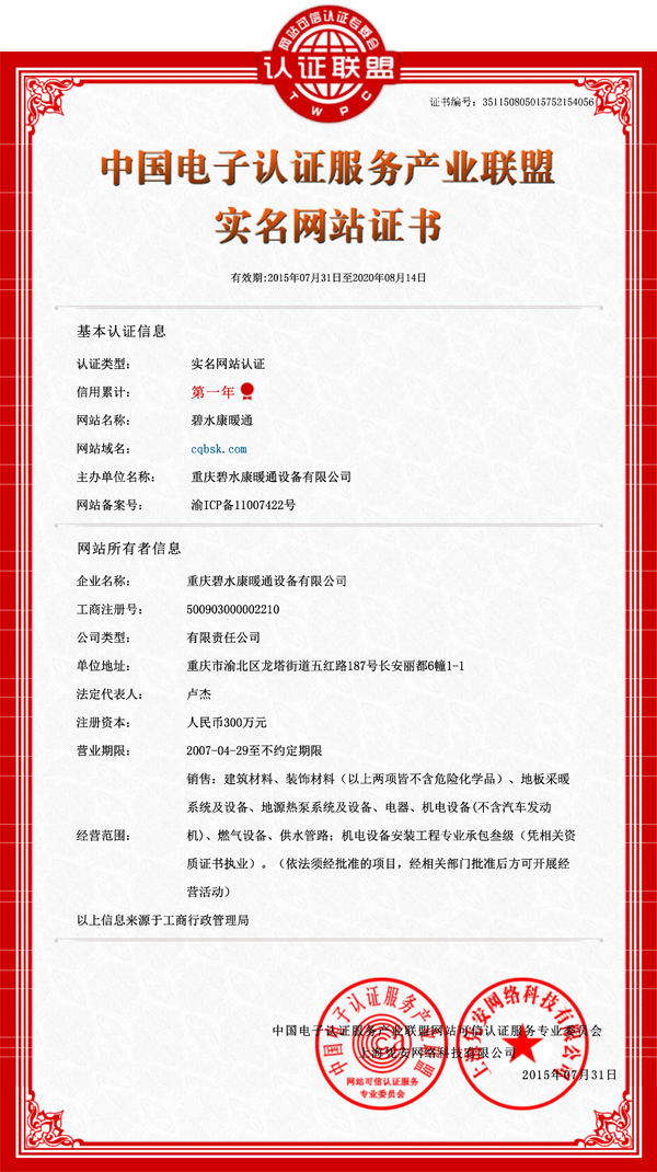 7月31日,碧水康暖通公司網(wǎng)站成功通過(guò)了中國(guó)電子認(rèn)證網(wǎng)站可信認(rèn)證服務(wù)專業(yè)委員會(huì)的實(shí)名認(rèn)證。