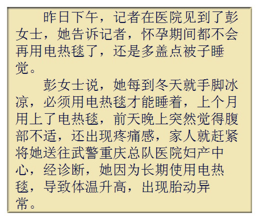 標題:重慶一孕婦使用電熱取暖設(shè)備,導致胎動異常!